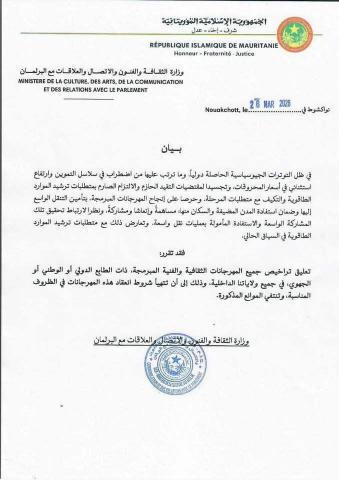 أعلنت وزارة الثقافة والفنون والاتصال والعلاقات مع البرلمان تعليق تراخيص جميع المهرجانات الثقافية والفنية المبرمجة في الولايات الداخلية، بمختلف تصنيفاتها الدولية والوطنية والجهوية، وذلك إلى حين توفر الظروف الملائمة لتنظيمها.