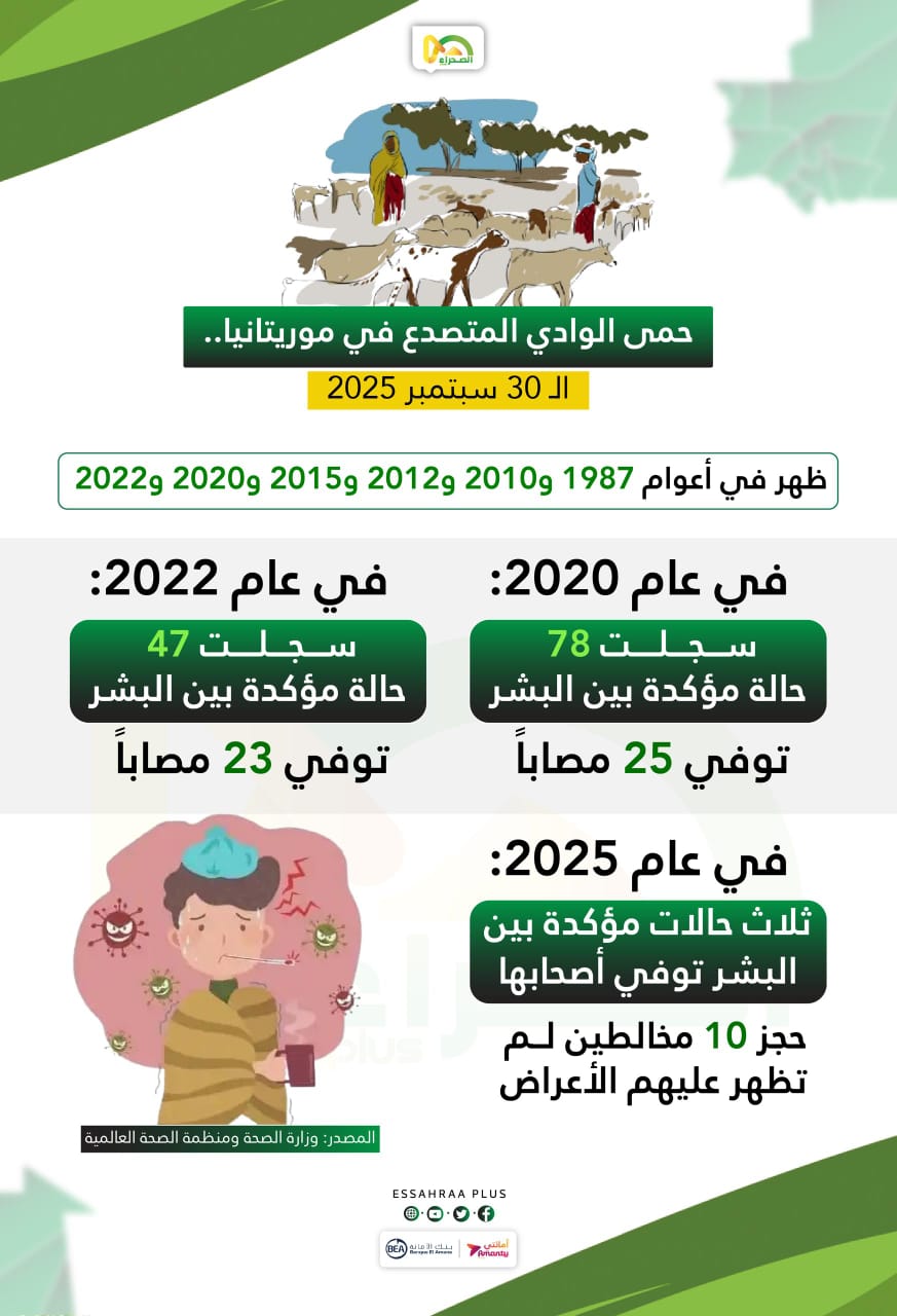 أعلنت وزارة التنمية الحيوانية، اليوم الثلاثاء، تسجيل وفاة شخصين وعدة بؤر من حمى الوادي المتصدع بين الحيوانات في بعض مناطق موريتانيا، دون تحديدها.