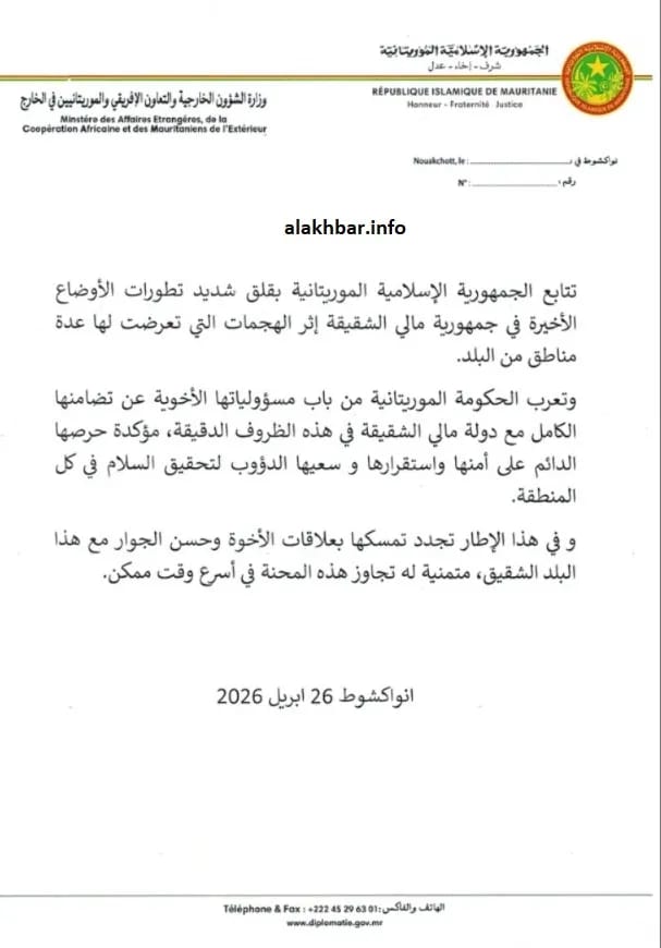 وجه فخامة رئيس الجمهورية، السيد محمد ولد الشيخ الغزواني، اليوم الأحد، برقية تهنئة إلى فخامة السيد سيريل رامافوزا، رئيس جمهورية جنوب إفريقيا، بمناسبة احتفال بلاده بعيدها الوطني.