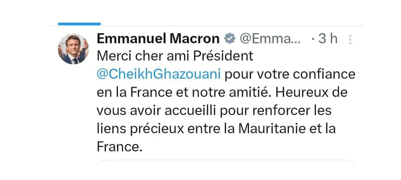 وأشاد الرئيس الفرنسي في تغريدة عبر منصةX تويتر سابقا، بالعلاقات الفرنسية الموريتانية.