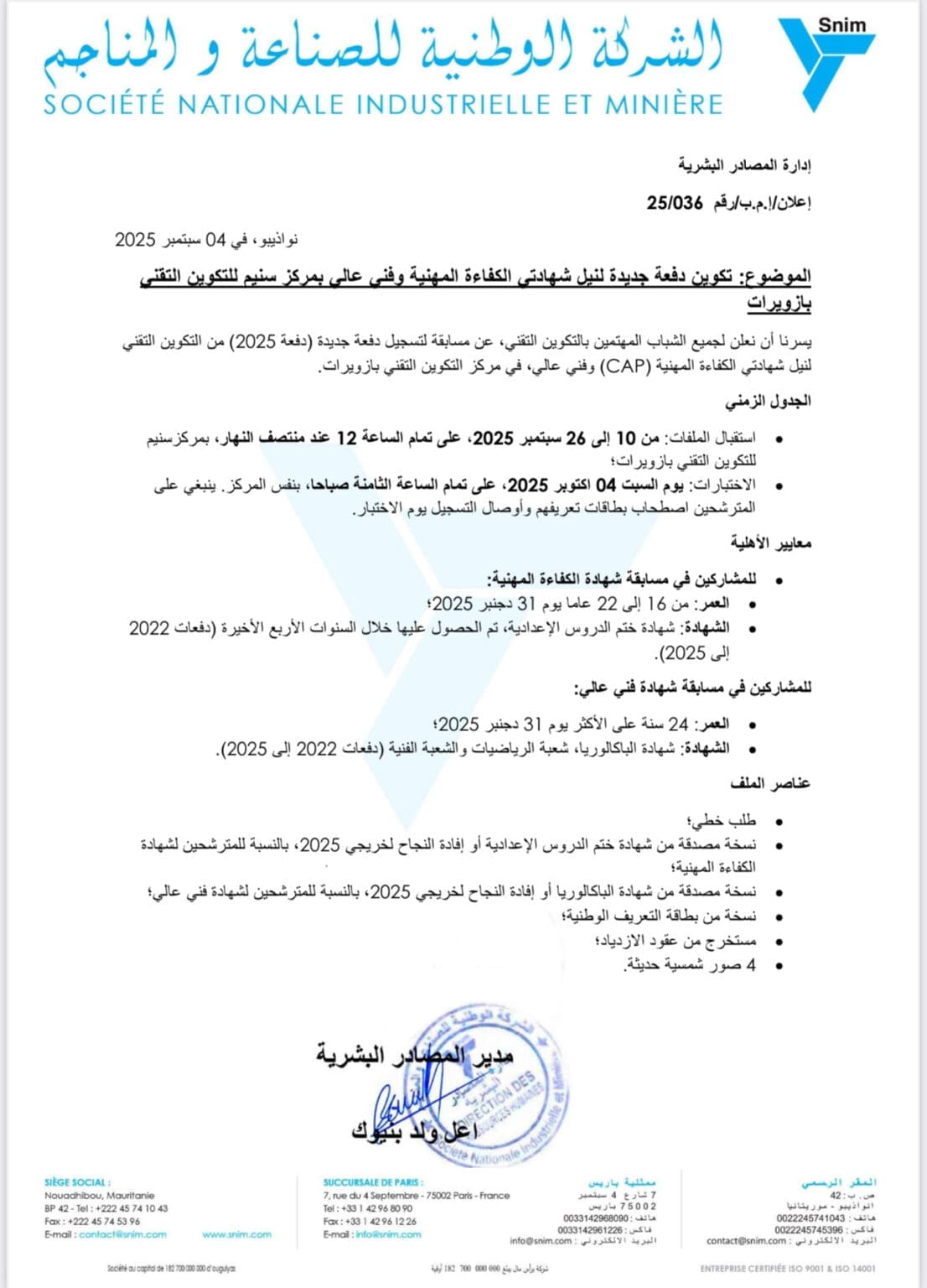 أعلنت الشركة الوطنية للصناعة والمناجم «سنيم» عن تنظيم مسابقة لتسجيل دفعة جديدة في مركز التكوين التقني بازويرات، لنيل شهادتي الكفاءة المهنية (CAP) وفني عالي.