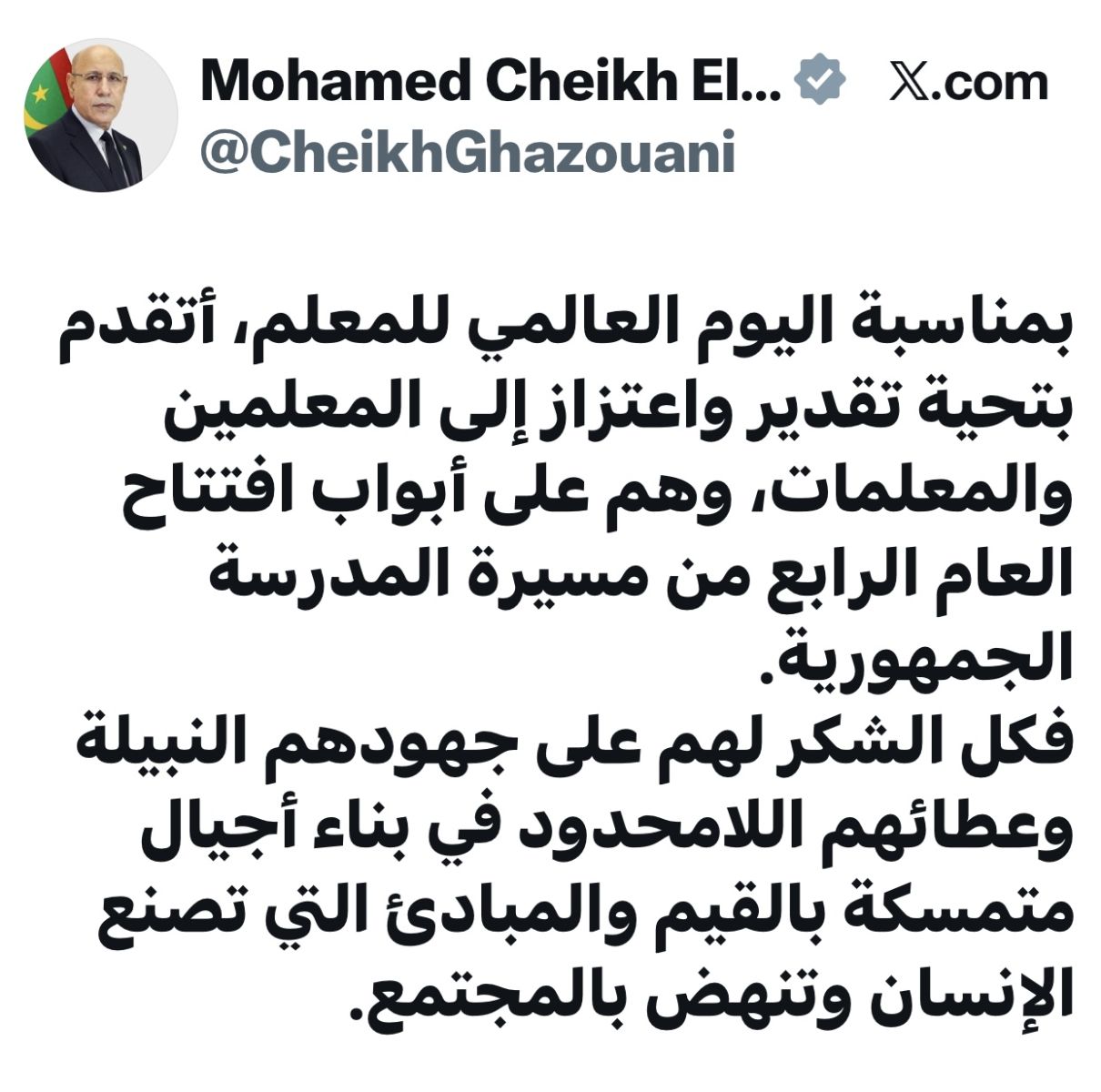 وجه الرئيس محمد ولد الشيخ الغزواني، اليوم الأحد، "تحية تقدير واعتزاز" إلى المعلمين والمعلمات، بمناسبة اليوم العالمي للمعلم الموافق للخامس من أكتوبر.