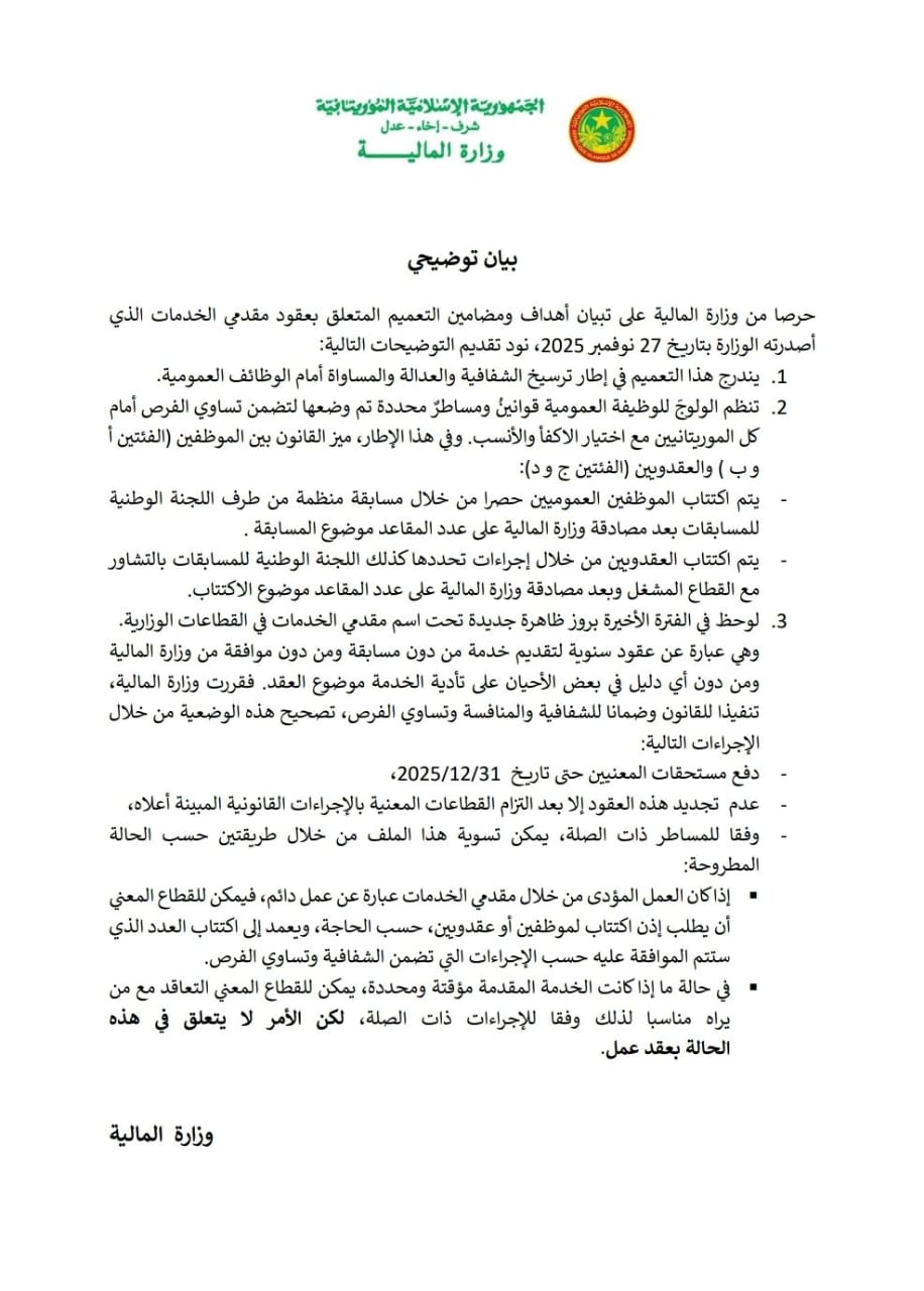 قالت وزارة المالية إن التعميم الذي أصدرته والمتعلق بعقود مقدمي الخدمات هدفه ترسيخ الشفافية والعدالة والمساواة أمام الوظائف العمومية.