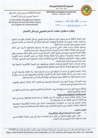 أعلنت اللجنة المكلفة بتسيير وصرف موارد صندوق الدعم العمومي لوسائل الاتصال، فتح باب الترشح واستقبال ملفات المؤسسات الإعلامية والهيئات الصحفية الراغبة في الاستفادة من الدعم العمومي المقدم لصالح وسائل الاتصال لسنة 2025.