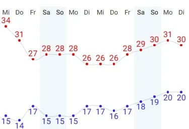ومن المتوقع أن تسجل العاصمة أدنى درجات حرارة عظمى لها خلال منتصف الأسبوع المقبل (أيام الثلاثاء والأربعاء والخميس)، حيث ستنخفض لتصل إلى 26° مئوية.