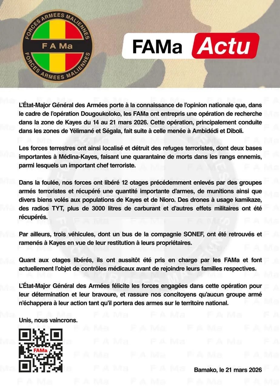 أعلنت هيئة الأركان العامة للقوات المسلحة المالية مقتل نحو 40 مسلحا "بينهم قيادي بارز"، وذلك خلال "تدمير مخابئ إرهابية، بينها قاعدتان مهمتان في مدينة خاي" غربي البلاد، قرب الحدود مع موريتانيا.